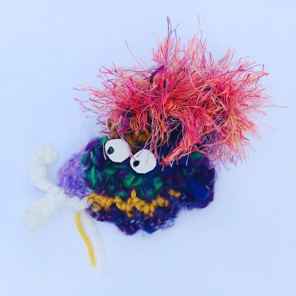 In previous posts I referred to experimental scrumbles as SCRUMBLE JUMBLES as to the untrained eye they can appear odd. However I have found that by adding a couple of eyes these first experimental latch patches can become a cute ‘Beasty Brooch‘.