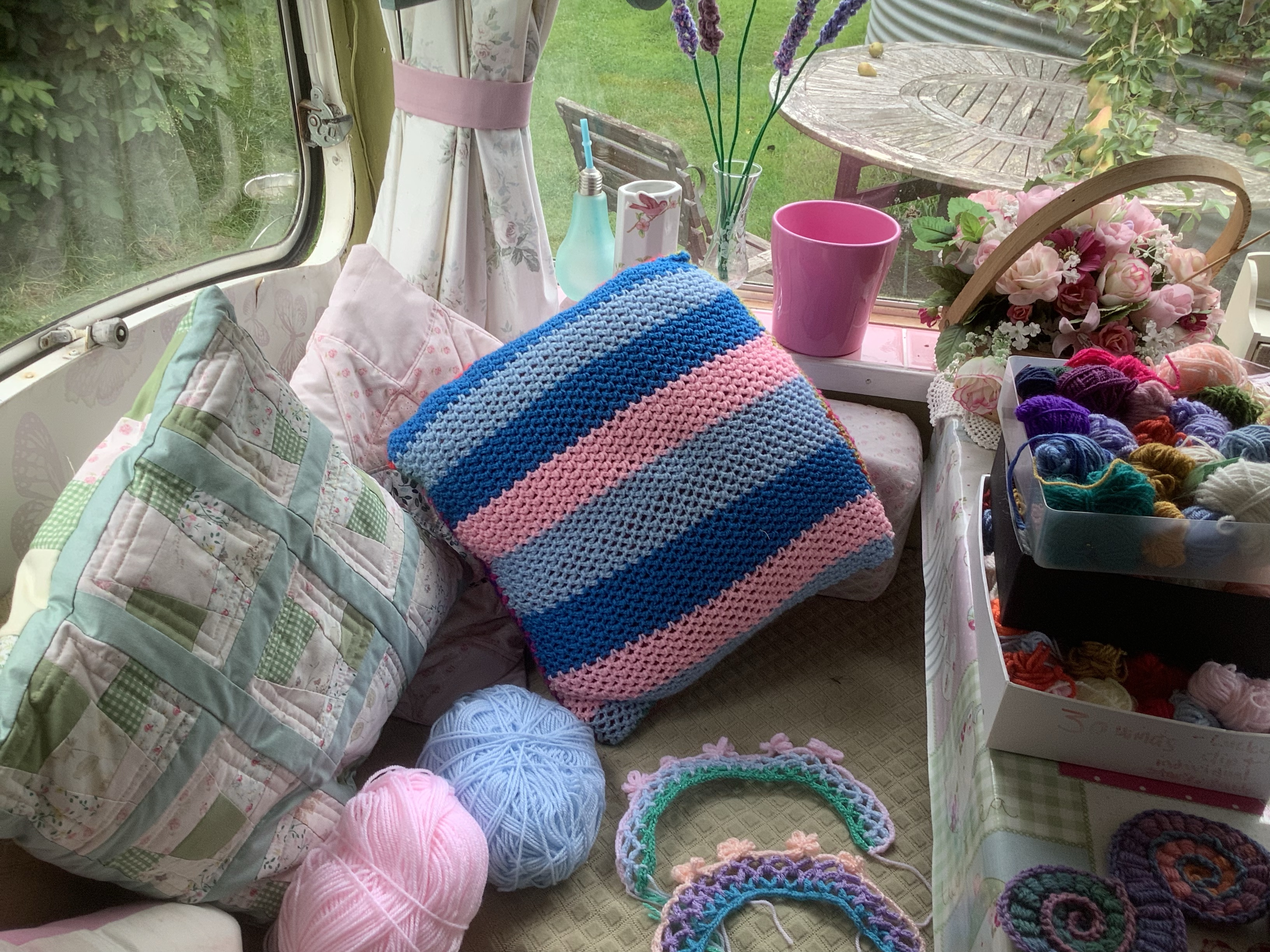 In the Uk we are trying to get back to some kind of normal. My first class has now had three sessions at the Severn Hospice with some lovely ladies who are absolute crochet beginners. They are following the new idea of just using two stitches to make things. These are chain and slip stitch, although some have snook in the bullion stitch too because it is such a fun stitch to do and has so much texture. We are having great fun experimenting with this way forward and I love how they surprise me with their work!